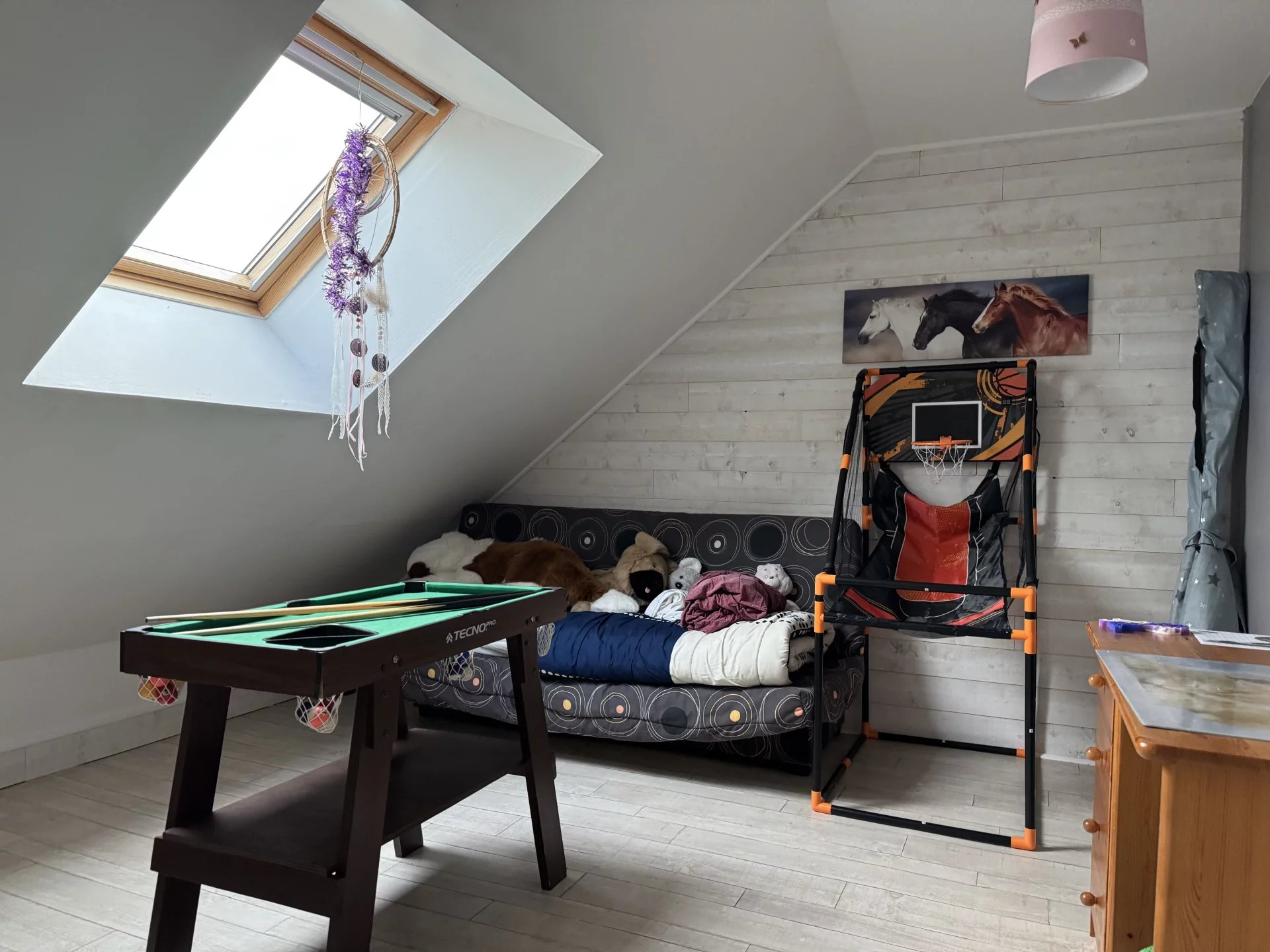 Au rez-de-chaussée se trouve une première chambre avec son point d’eau. Aujourd’hui utilisée en salle de sport, elle sera parfaite pour une chambre d’amis, un bureau, une salle loisir ou autre. Vous trouverez également un grand garage d’environ 25m² ainsi qu’une cave/espace de stockage de près de 20m².